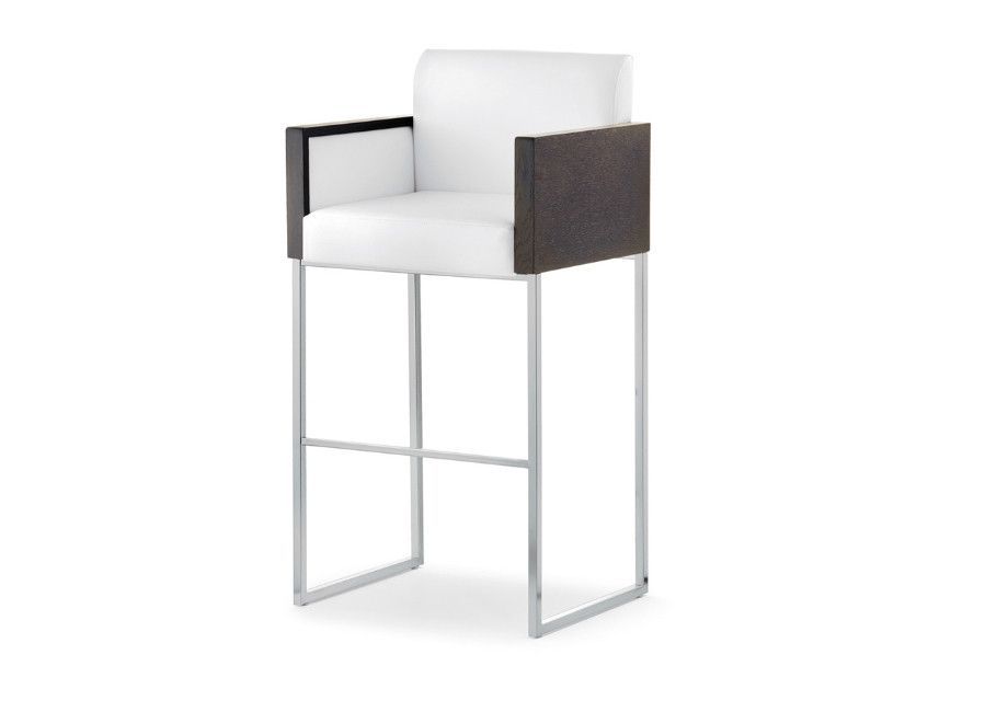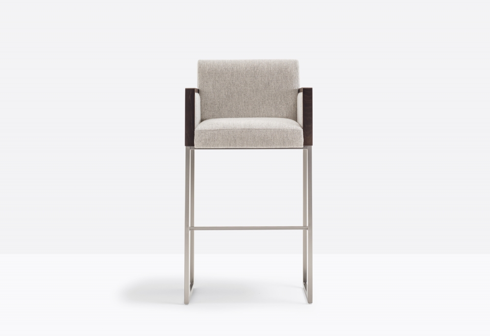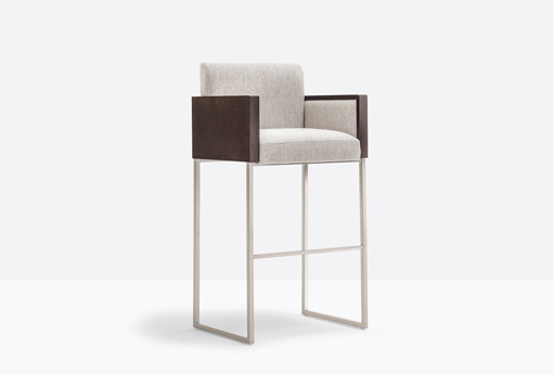Box is characterized by/has rigouros outlines along with the use of different materials, as wood and metal combined with the upholstery. Barstool with sandwich panel core in oak with shell, backrest and sides upholstered in fabric, leather or simil leather. Steel tube sled frame 20x20 mm with footrest. Seat height 785 mm.